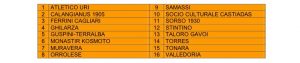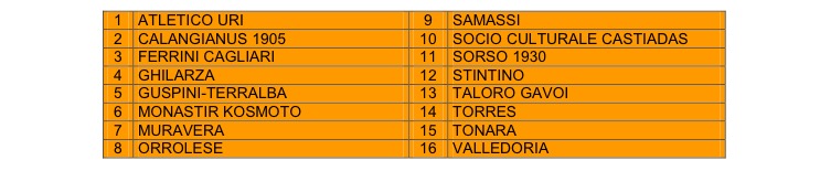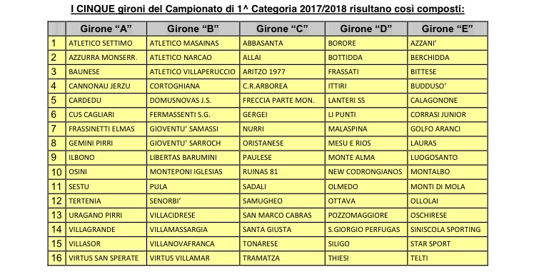 PRIMA CATEGORIA. Due rinunciatarie per un totale di 79 delle 81 Società aventi diritto (non hanno regolarizzato la domanda le Società Gennargentu Desulo e La Caletta). Il Consiglio direttivo del Comitato ha assegnato quattro posti vacanti nell’organico alle Società Tonarese, Paulese, Atletico Settimo e Ilbono, società non aventi diritto che hanno presentato domanda.